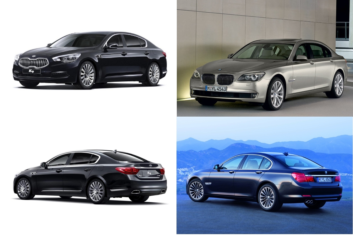 Kia heeft de K9 vandaag onthuld. Toen ik hem zag moest ik meteen aan de BMW 7-serie denken. Daarom heb ik een foto vergelijking gemaakt. Zoals je ziet komt vooral de achterkant overeen met de BMW. Kia is nieuw in dit segment en heeft daarom de BMW 7-serie als voorbeeld genomen. De motoren zullen waarschijnlijk een 3,8 liter V6, een 4,6 liter V8 en een 5,0 liter V8 zijn. Alleen in Korea gaat hij K9 heten, de export versies krijgen een andere naam.